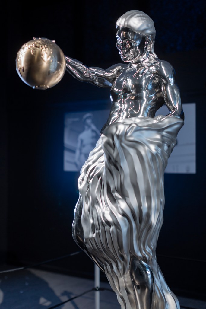 Det mest spektakulära föremålet i Galleri AI är en skulptur i glänsande stål – en sammansmältning av mänsklig kreativitet som spänner över tre kontinenter och 500 år tillbaka i tiden. Statyn skapades genom att träna flera AI-modeller på arbetet från några av världens största och mest kända skulptörer – ikoniska konstverk av Michelangelo, Rodin, Kollwitz, Kotaro och Savage.